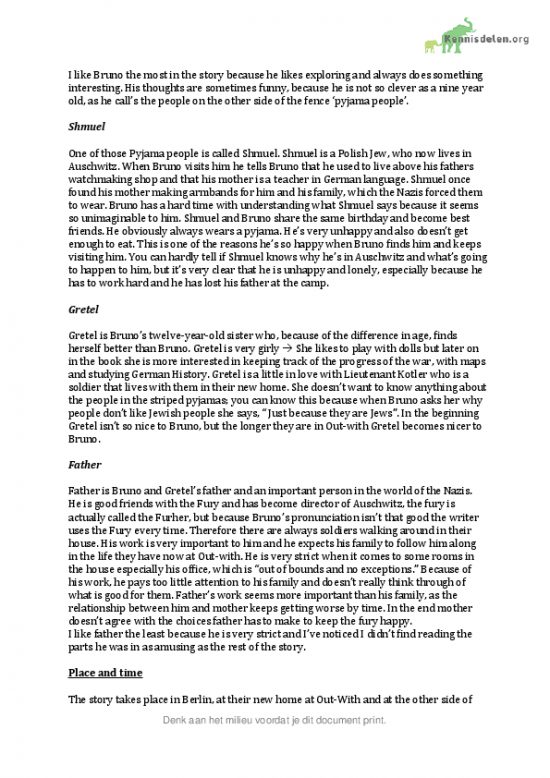 The boy in the striped pyjamas boekverslag in het engels uit HAVO leerjaar 5. ik heb een 9 gekregen door de uitgebreide uitleg die ik na een korte samenvatting heb gegeven. het is dus wat makkelijker te onthouden. ik stel voor dat je na de aankoop en het doornemen en eventueel naar je eigen hand zetten, het verslag doorneemt met je docent aangezien elke school/docent andere eisen heeft voor een verslag. maakt het jezelf wat makkelijker en krijg je het verslag goed in je hoofd.