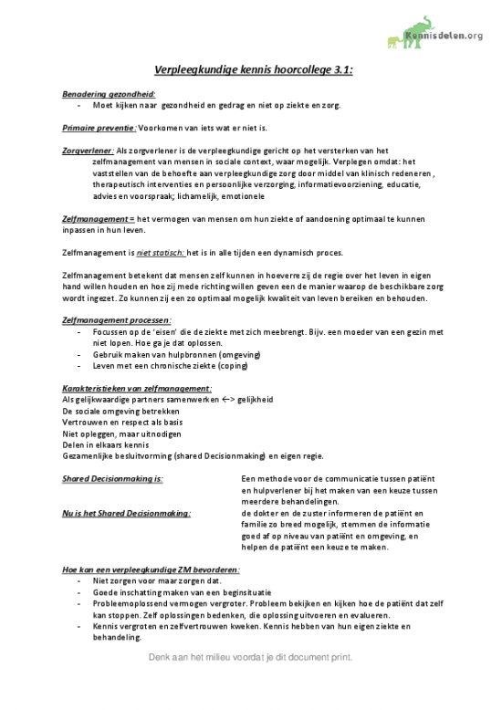 Samenvatting van verpleegkundige kennis periode 1, leerjaar 1. Alle powerpoints van het werkcollege en hoorcollege staan er in met alle uitgewerkte leerdoelen.