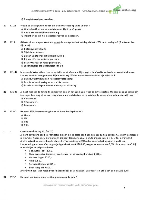 Dit document bevat 5 oefenexamens gericht op WFT Basis voor de periode april 2021 tot en met maart 2022. Ieder oefenexamen bevat 42 vragen, net als in het echte examen. De examenvragen zijn gebaseerd op de meest recente eind- en toets termen van het CDFD. Zo weet je zeker dat je kennis maakt met de juiste vragen en leer je zo efficiënt mogelijk.